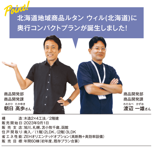 今回リリースしたプランは、従来に比べて間口を広げ奥行をコンパクトにすることで敷地対応のバリエーションをさらに強化しました。間取りは2LDK/3LDKのファミリータイプ。ZEHオリエンテッド、宅配ボックス、内装アイテムなど豊富なオプション仕様も備えた商品となっています。