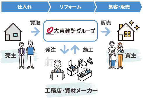2022年より、持ち家志向のお客様に低価格で高品質な中古戸建住宅を提供する「Reコダテ」事業を開始しました。住宅の再生と良質な住宅ストックを提供する本事業は、社会課題となっている空き家の削減や、住宅の循環利用を促すことにもつながります。社会課題の解決や社会の持続可能性の向上に貢献しながら、グループの事業領域を拡大しています。