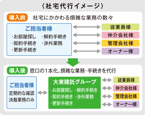 現在、社宅斡旋業務協定企業(社宅が必要な際に情報をいただける企業)様は3千社を超え、社宅代行やマンスリー提案などの法人需要の取り込みだけでなく、オフィス仲介や社有地情報(自社寮の建て替え・売却など)の取得を行い、売上増大を図っています。