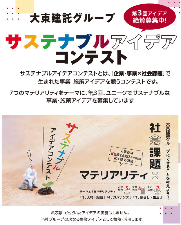 第3回は、マテリアリティ「3.人材・組織」「4.ガバナンス」「7.暮らし・生活」をテーマにサステナブルなアイデアを募集中!応募いただいたアイデアは、社長の竹内さん直々に審査いただきます。
