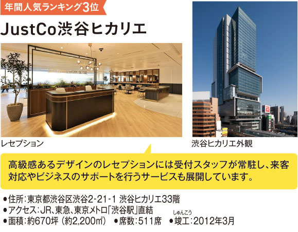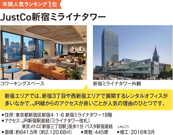 JustCo DK Japanは、JUST FIT OFFICE※1が発表した日本全国の主要都市におけるシェアオフィス・レンタルオフィス(掲載数1,237施設)の年間人気ランキング※2において、「JustCo新宿ミライナタワー」が1位、「JustCo渋谷ヒカリエ」が3位に選ばれました。